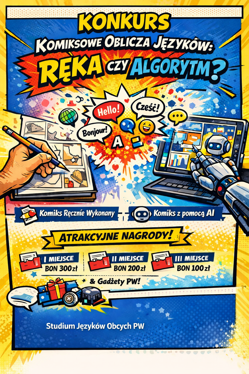 Studium Języków Obcych Politechniki Warszawskiej zaprasza studentów do udziału w konkursie „Komiksowe Oblicza Języków: Ręka czy Algorytm?”. To wyjątkowa okazja, by połączyć kreatywność, humor i refleksję nad nauką języków obcych z artystyczną formą komiksu — zarówno tradycyjnego, jak i tworzonego przy wsparciu sztucznej inteligencji.
