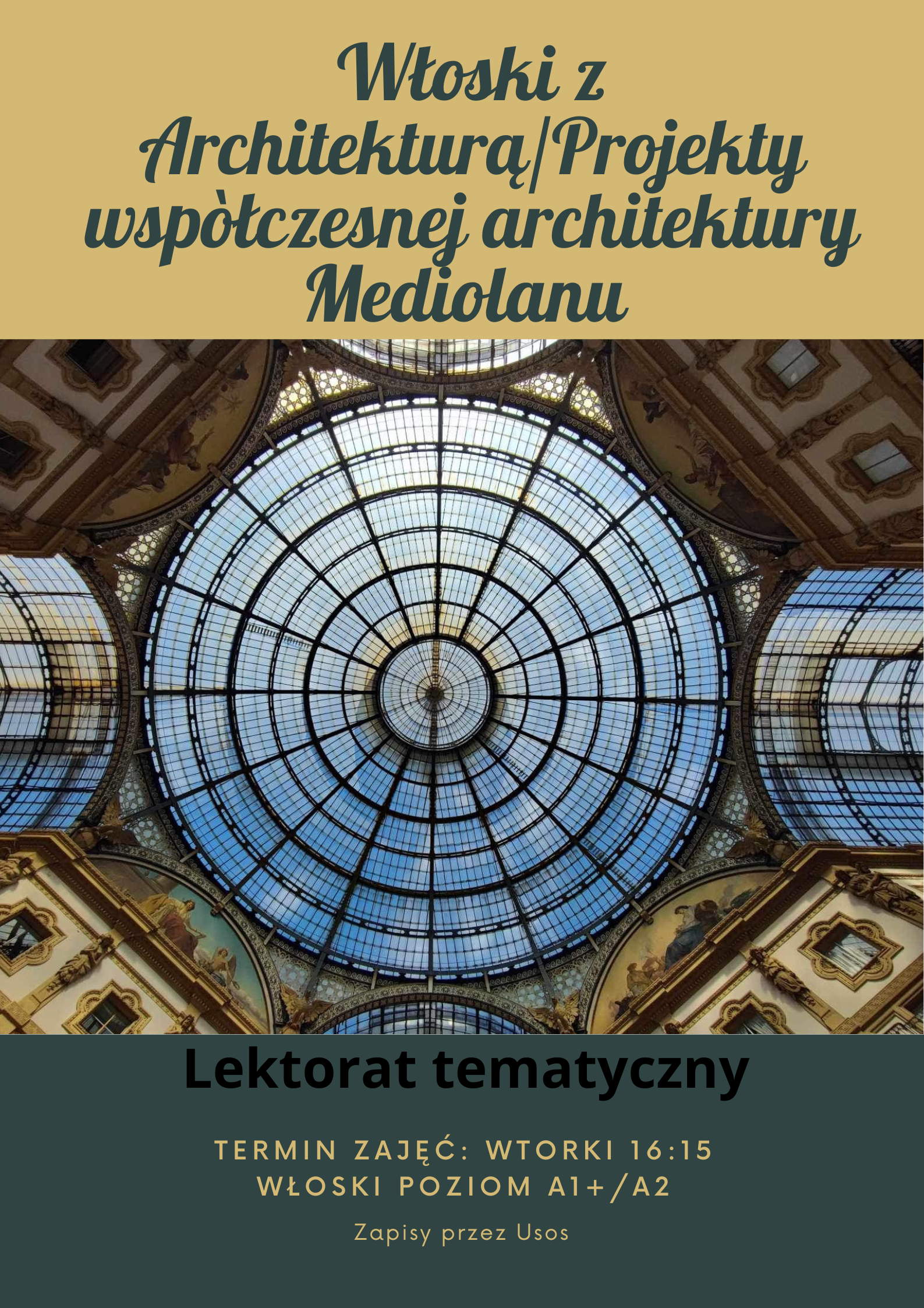 Zapraszamy na kurs projektowy Język włoski z Architekturą/Projekty Współczesnej Architektury Mediolanu przygotowany we współpracy z Politechniką w Mediolanie z udziałem gości z uczelni mediolańskiej. Lektorat jest dostępny w ofercie lektoratów tematycznych Studium Języków Obcych w semestrze zimowym 2025/26.